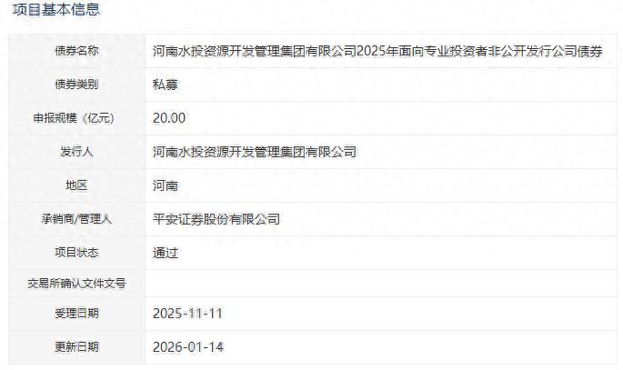 【大河财立方消息】1月15日消息德旺配资,河南水投资源开发管理集团有限公司2025年面向专业投资者非公开发行公司债券项目获深交所通过。本期债券拟发行金额20亿元,承销商/管理人为平安证券。